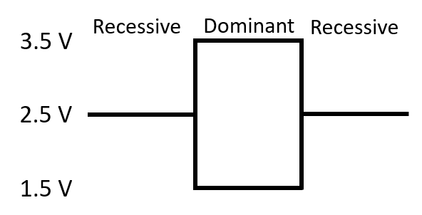 With CAN, we sometimes refer to dominant or recessive bus states. Understanding this is important when we talk about arbitration later on. Intuitively, you would probably think that a binary 1 is dominant and a binary 0 is recessive. However, once again, it's exactly the opposite. When the bus is idle, or both CAN H and CAN L are at 2.5 V, this represents a binary 1 and is referred to as the recessive state. When CAN H and CAN L diverge, this represents a binary 0 and is referred to as the dominant state. Since all the nodes are 'listening' to the bus as they are transmitting, they can detect when they are transmitting a recessive 1 while another node is transmitting a dominant 0. If a node sees the CAN H and CAN L voltage diverge while it's transmitting a recessive 1, that node knows to stop transmitting because a message with higher priority is being sent to the bus. The losing node can try to send it's message after the higher priority message has finished transmitting.