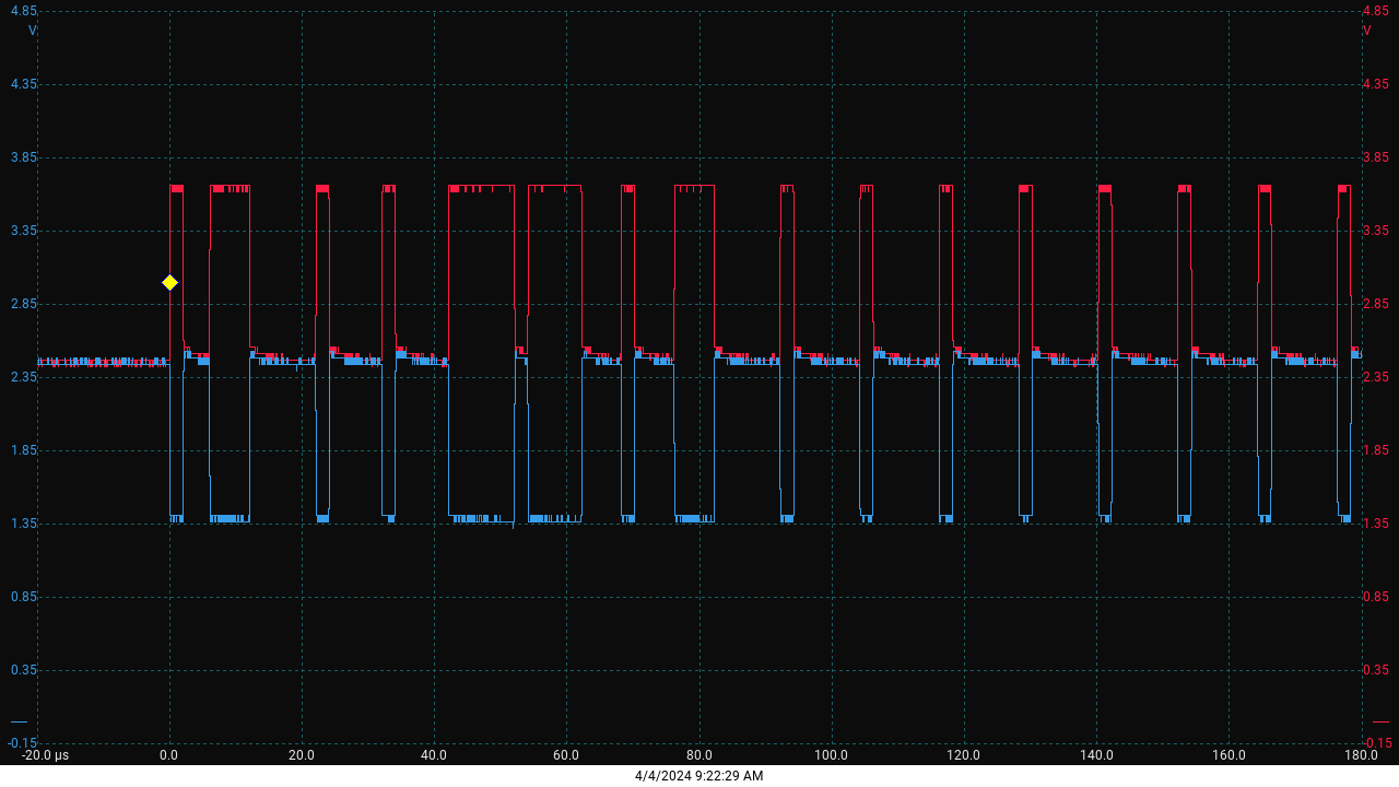 The naming of these circuits is actually pretty intuitive. The CAN H wire increases in voltage to indicate a state change, while the CAN L wire decreases in voltage. When the bus is idle, both wires are at the same voltage. Since CAN H and CAN L change states simultaneously, the CAN waveform looks like a mirror image, with the CAN H signal going up from 2.5 V to 3.5 V while the CAN L signal is going down from 2.5 V to 1.5 V.