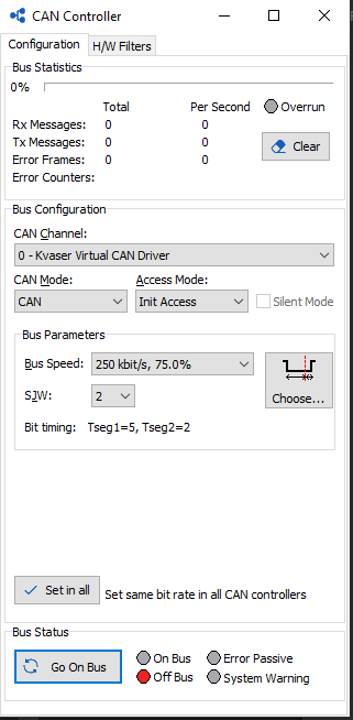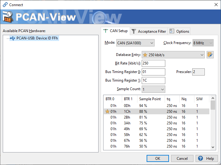 When you first open the PCAN-View software, you'll see the hardware interface setup screen, where you can set your baud rate and bus timing parameters. The default settings for each baud rate are usually fine for most cases and don't require tinkering unless you run into problems.