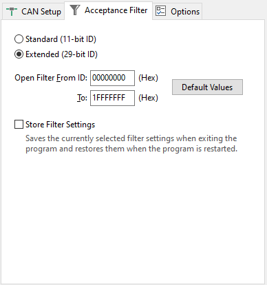 After you set up the CAN baud rate and timing parameters, you can set up an acceptance filter. This is convenient if you are only looking for a specific message and don't care about the rest of the network activity. Vehicle networks can have hundreds of messages that make it difficult to focus on the one or two messages you need to see.