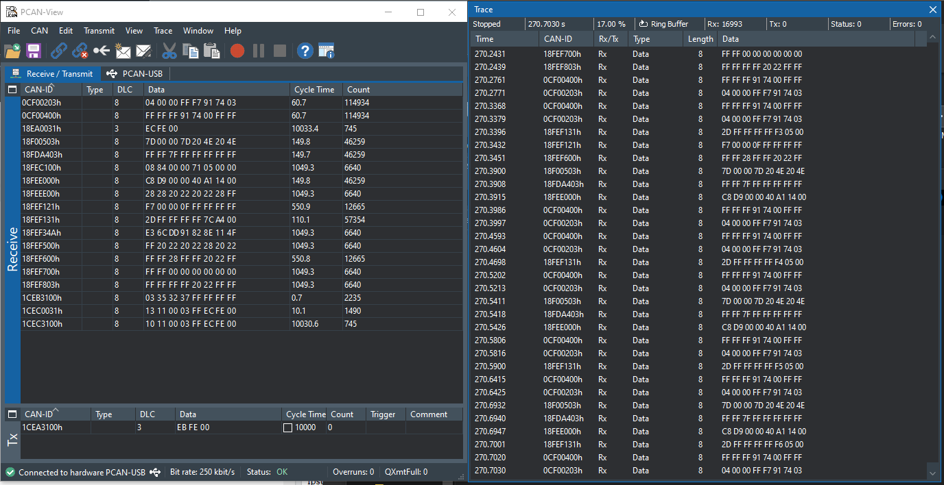 What I like about the Peak software is the ability to view the CAN data in a 'fixed' manner and a 'trace' at the same time. You can start recording a trace and save it to a .trc file, which opens with Peak software or any text editor. You can also view the trace right in the software, which is a little lighter than saving to a file and opening in another program.