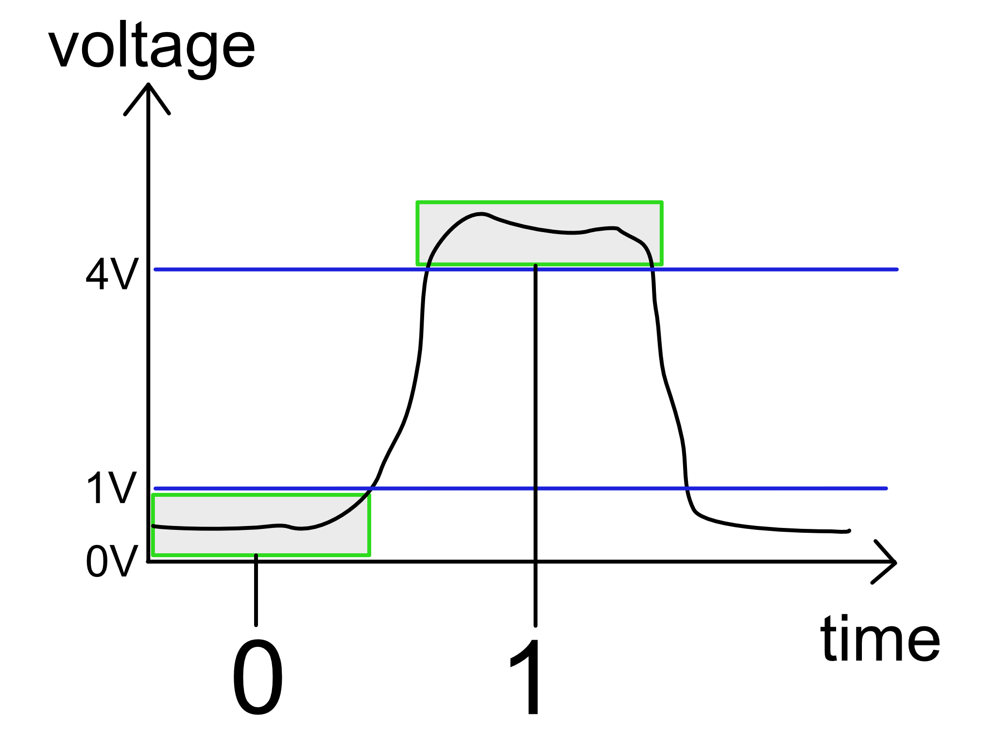 For example, we can say that if the voltage measured is below +1V, then we'll consider that a logical 0. If the voltage measured is above +4V, then we'll consider that a logical 1.