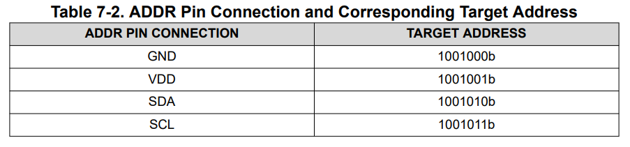 The addr pin is grounded to set the address for the ADC board on the I2C bus. According to the ADS 1115 datasheet, the address is set by connecting the addr pin to ground, power, SDA, or SCL as shown in the table below. In our case, the address will be 0b1001000 or 0x48.