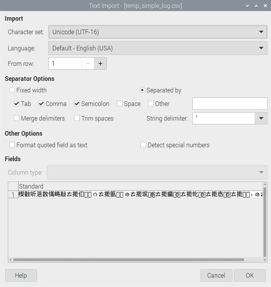 If you open your .csv file with Libre Office and see a bunch of gibberish, don't panic. Just check the character set selection on the text import dialog. It should be set to Unicode (UTF-8).