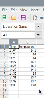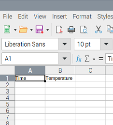 We'll start with the easy part. Create a new .csv file in the same directory as your Python file. If you don't already have Libre Office installed, go ahead and install it. Open the .csv file with Libre Office Calc and add some headers for your data in the top row of cells. I chose "Time" and "Temperature" but you can put whatever you like in here. These header names will be referenced by our chart.js call to read the .csv data into a html table. If you don't plan to post the data graphically, you don't really need headers at all. Save the .csv file (make sure you keep the .csv extension and don't convert to .ods) and close it.