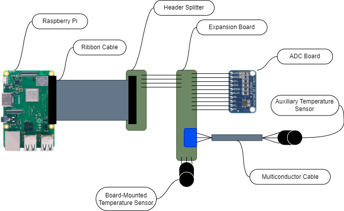 For this project, I used a ribbon cable, a header splitter, and expansion board so that I could easily connect and disconnect the ADC and temperature sensor. The header splitter makes it possible to still use the Pi's available GPIO for other projects, like my indoor garden. The expansions board makes it easier to distribute power and ground to the 4 sensors that could potentially be connected to the ADC. I used pieces from this prototype board kit and jumper wire kit to build these boards and make the connections between the ADC board, the header splitter, and the temperature sensors. I even had enough room on the expansion board to solder one of the temperature sensors directly to the board. Up to 3 additional sensors can be added to this ADC board if I want to measure the temperatures of different locations. I added some screw terminals to connect more sensors later in case I want to measure indoor vs. outdoor temperature for example. The cartoon below roughly shows what the whole setup looks like.