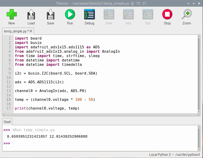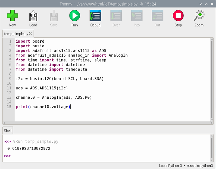 Click the Run button to run your code and look for a voltage value between 0 and 2 printed in the small window in the bottom of the Thonny editor window.